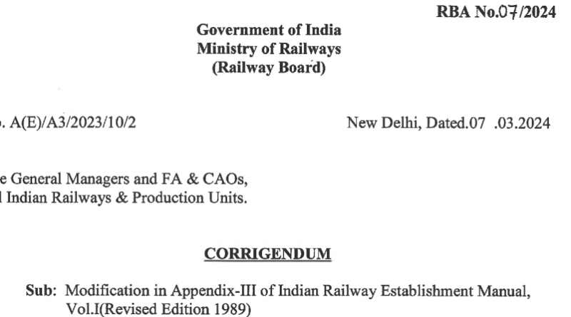 Modification in Appendix-III of Indian Railway Establishment Manual, Vol. I – ACS No. 288: RBA No. 07/2024