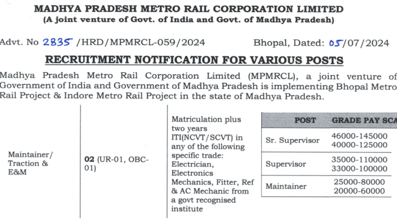 MP Metro Recruitment 2024 Notification : Madhya Pradesh Metro Rail Corporation Limited (MPMRCL) has been released the full notification on 05/07/2024 for the post of Maintainer/ Junior Assistant/ Supervisor/ Sr. Supervisor etc. on Contract Basis for ITI, Diploma & Degree, BE/ B.Tech etc. pass out candidate. MP Metro Recruitment online form apply before 05-08-2024.