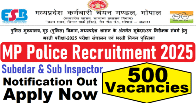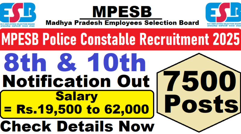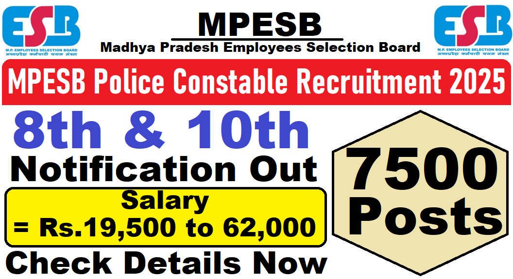 MPESB Police Constable Recruitment 2025 : Madhya Pradesh Employees Selection Board (MPESB) की ओर से 7500 Posts पर Recruitment निकली है जिसका Online form 15/09/2025 से शुरू है | MPESB Police Constable Recruitment 2025 Online form 29/09/2025 तक भरा जायेगा |8th/10th Pass in various candidates MPESB Police Constable Recruitment 2025 online form भर सकता है | Interested and eligible candidates MPESB Police Constable Recruitment 2025 form भर सकते हैं | MPESB Police Constable Recruitment Full Notification निचे दिया गया हैI MPESB Police Constable Recruitment Apply Link निचे दिया गया है I