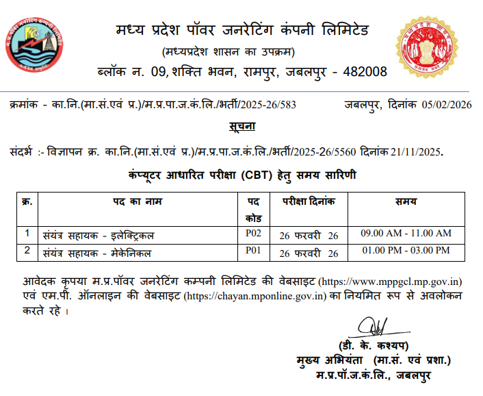MPPGCL Plant Assistant Recruitment 2026 Exam Notice