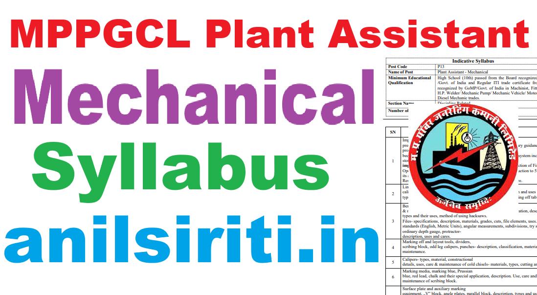 MPPGCL Plant Assistant Mechanical Official Syllabus 2025 Out: Madhya Pradesh Power Generating Company Limited की और से Plant Assistant Posts पर Recruitment निकली है जिसका Online form 01-12-2025 से भरना शुरू होगा | MPPGCL Plant Assistant Electrical और Mechanical Posts पर Recruitment है | MPPGCL Plant Assistant Electrical, Mechanical Posts के Mock Test Anil Sir ITI App पर देखने को मिलेगा | MPPGCL Plant Assistant Mechanical Syllabus निचे दी गयी है | MPPGCL Plant Assistant Mechanical के सभी Trade का Paper एक ही होगा | MPPGCL Plant Asistant Exam Trade wise paper नही बनता है Posts wise Paper बनाया जाता है | MPPGCL Plant Assistant Mechanical Official syllabus को download करके दिया गया Chapter का Mock Test शुरू करिए |