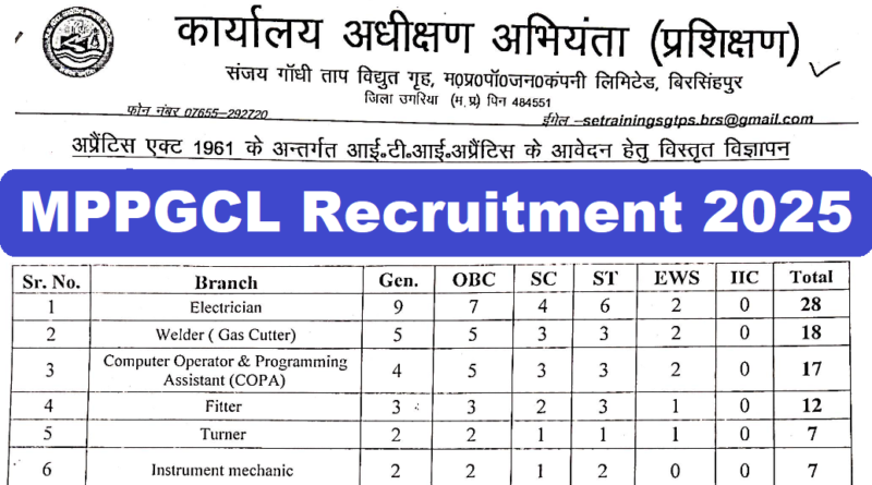 MPPGCL Recruitment 2025 : Madhya Pradesh Power Generating Company Limited (MPPGCL) की ओर से 95 Posts पर Recruitment निकली है जिसका Online form 14/07/2025 से शुरू है | ITI Pass in various candidates MPPGCL Recruitment 2025 online form भर सकता है | Interested and eligible candidates MPPGCL Recruitment 2025 form भर सकते हैं | MPPGCL Recruitment Full Notification निचे दिया गया हैI MPPGCL Recruitment Apply Link निचे दिया गया है I