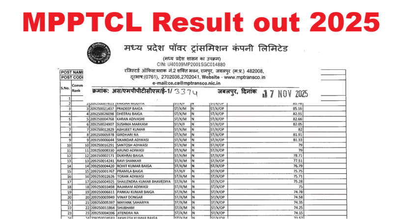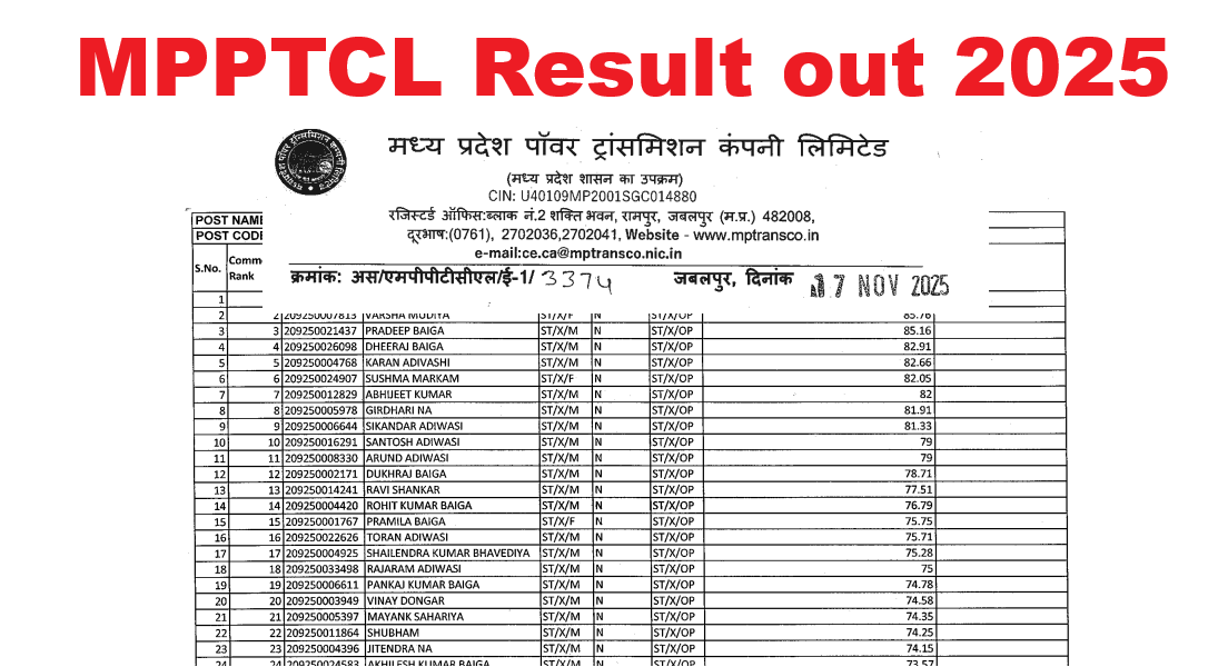 MPPTCL SSA, JE, SA, AET Result 2025 Out, MPPTCL Cut off 2025 Out Madhya Power Transmission Company Limited (MPPTCL) की ओर से 633 Posts पर Recruitment निकली थी जिसका Written Exam 22th Sep 2025 to 24th Sep 2025 तक हुई थी जिसका Result और Cut off जारी कर दिया गया है | Madhya Power Transmission Company Limited Result और Cut off निचे दी गयी है |