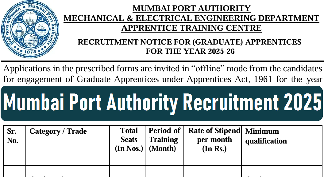 Mumbai Port Authority Recruitment 2025 : Mumbai Port Authority (MPA) की ओर से 11 Posts पर Recruitment निकली है जिसका Offline form शुरू है |Mumbai Port Authority Recruitment 2025 Offline form 10/11/2025 तक भरा जायेगा |Graduate Pass in various candidates Mumbai Port Authority Recruitment 2025 offline form भर सकता है | Interested and eligible candidates Mumbai Port Authority Recruitment 2025 form भर सकते हैं | Mumbai Port Authority Recruitment Full Notification निचे दिया गया हैIMumbai Port Authority Recruitment Speed Post Application Form Address निचे दिया गया है I