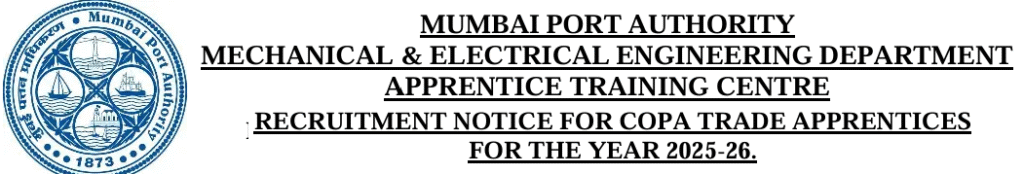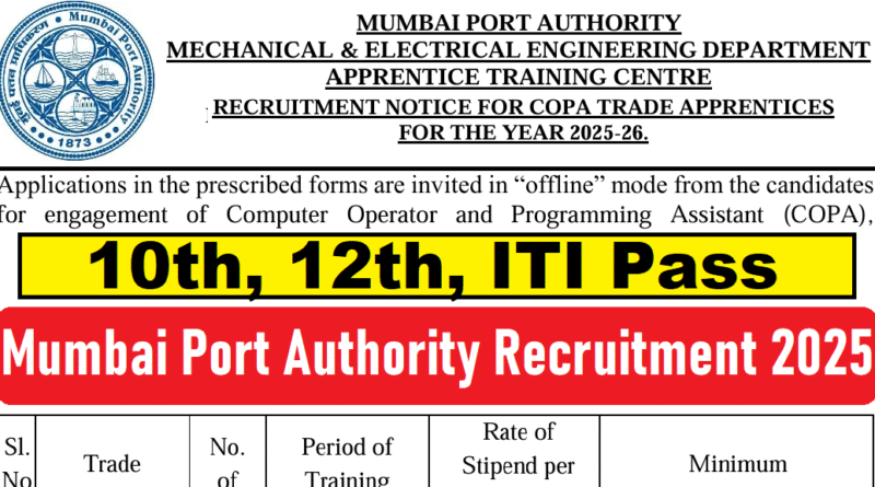 Mumbai Port Authority Recruitment 2025 : Mumbai Port Authority (MPA) की ओर से 105 Posts पर Recruitment निकली है जिसका Offline form शुरू है |Mumbai Port Authority Recruitment 2025 Offline form 10/11/2025 तक भरा जायेगा | 10th+ITI Computer Operator and Programming Assistant trade Pass in various candidates Mumbai Port Authority Recruitment 2025 offline form भर सकता है | Interested and eligible candidates Mumbai Port Authority Recruitment 2025 form भर सकते हैं | Mumbai Port Authority Recruitment Full Notification निचे दिया गया हैIMumbai Port Authority Recruitment Speed Post Application Form Address निचे दिया गया है I
