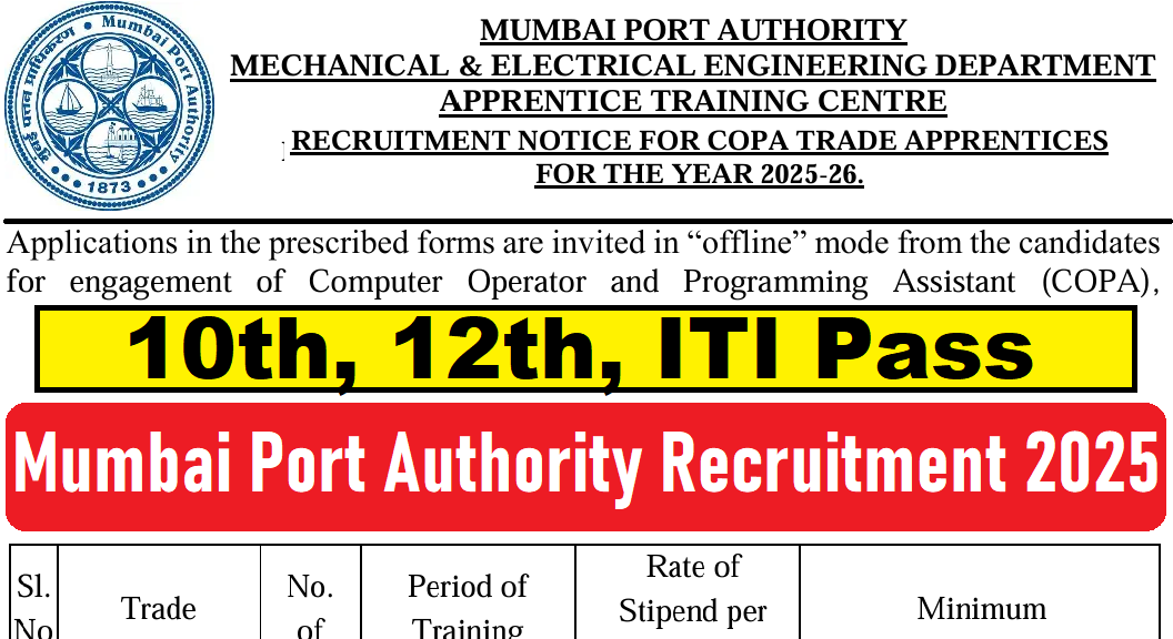 Mumbai Port Authority Trade Apprentice Recruitment 2025,105 Posts, 10th+ITI Pass Latest Vacancy 2025