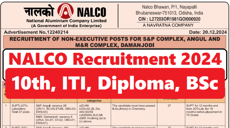 NALCO Non Executive Recruitment 2025: National Aluminium Company Limited की ओर से Non Executive के Various Posts पर Recruitment निकली है | NALCO Non Executive Recruitment 2025 10th, ITI, Diploma, BSc candidates form भर सकते हैं | NALCO Non Executive Recruitment 2025 Online form 31-12-2024 से भरना शुरू होगा | NALCO Recruitment 2024 Online form 21-01-2025 31-01-2025 तक भरा जायेगा | NALCO Recruitment 2024 की जानकारी निचे दी गयी है |