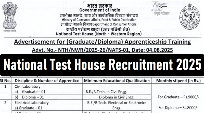 National Test House Recruitment 2025 : National Test House (NTH), Jaipur की ओर से 10 Posts पर Recruitment निकली है जिसका Online form 04/08/2025 से शुरू है | National Test House Recruitment 2025 Online form 25/08/2025 तक भरा जायेगा | Diploma & Graduate Pass in various candidates National Test House Recruitment 2025 online form भर सकता है | Interested and eligible candidates National Test House Recruitment 2025 form भर सकते हैं | National Test House Recruitment Full Notification निचे दिया गया हैI National Test House Recruitment Apply Link निचे दिया गया है I