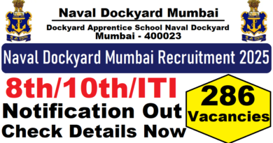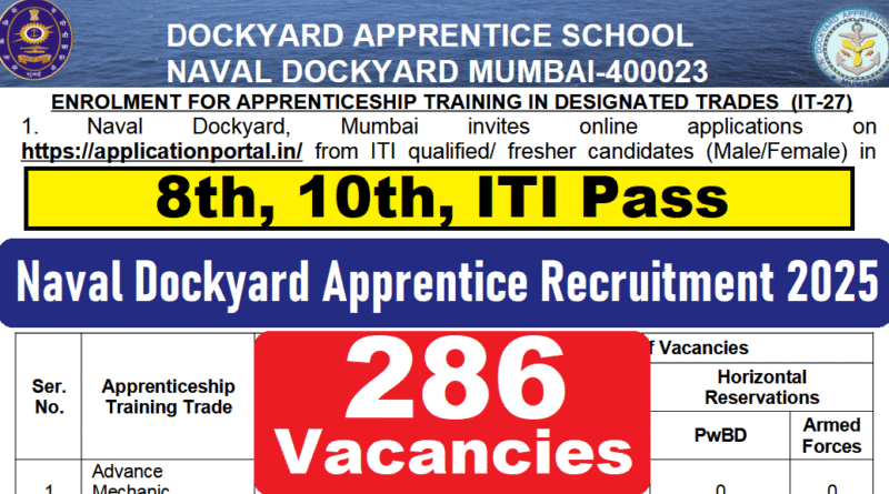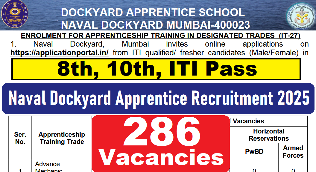 Naval Dockyard Apprentice Recruitment 2025 : Naval Dockyard, Mumbai की ओर से 286 Posts पर Recruitment निकली है जिसका Online form 25/08/2025 से शुरू है | Naval Dockyard Apprentice Recruitment 2025Online form 12/09/2025 तक भरा जायेगा | 8th, 10th & ITI Pass in various candidates Naval Dockyard Apprentice Recruitment 2025 online form भर सकता है | Interested and eligible candidates Naval Dockyard Apprentice Recruitment 2025 form भर सकते हैं | Naval Dockyard Apprentice Recruitment Full Notification निचे दिया गया हैI Naval Dockyard Apprentice Recruitment Apply Link निचे दिया गया है I