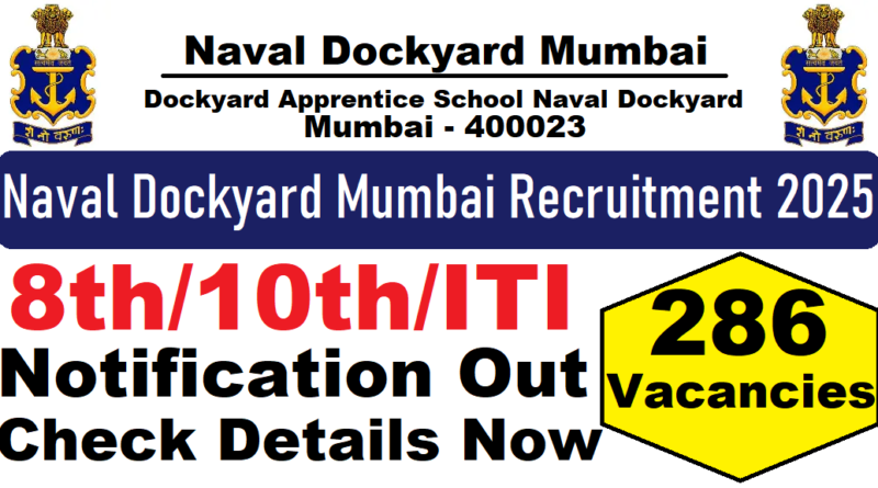 Naval Dockyard Mumbai Recruitment 2025 : Naval Dockyard Mumbai की ओर से 286 Posts पर Recruitment निकली है जिसका Online form 25/08/2025 से शुरू है | Naval Dockyard Mumba Recruitment 2025 Online form 12/09/2025 तक भरा जायेगा | 8th/10th/ITI Pass in various candidates Naval Dockyard Mumba Recruitment 2025 online form भर सकता है | Interested and eligible candidates Naval Dockyard Mumba Recruitment 2025 form भर सकते हैं | Naval Dockyard Mumba Recruitment Full Notification निचे दिया गया हैI Naval Dockyard Mumba Recruitment Apply Link निचे दिया गया है I