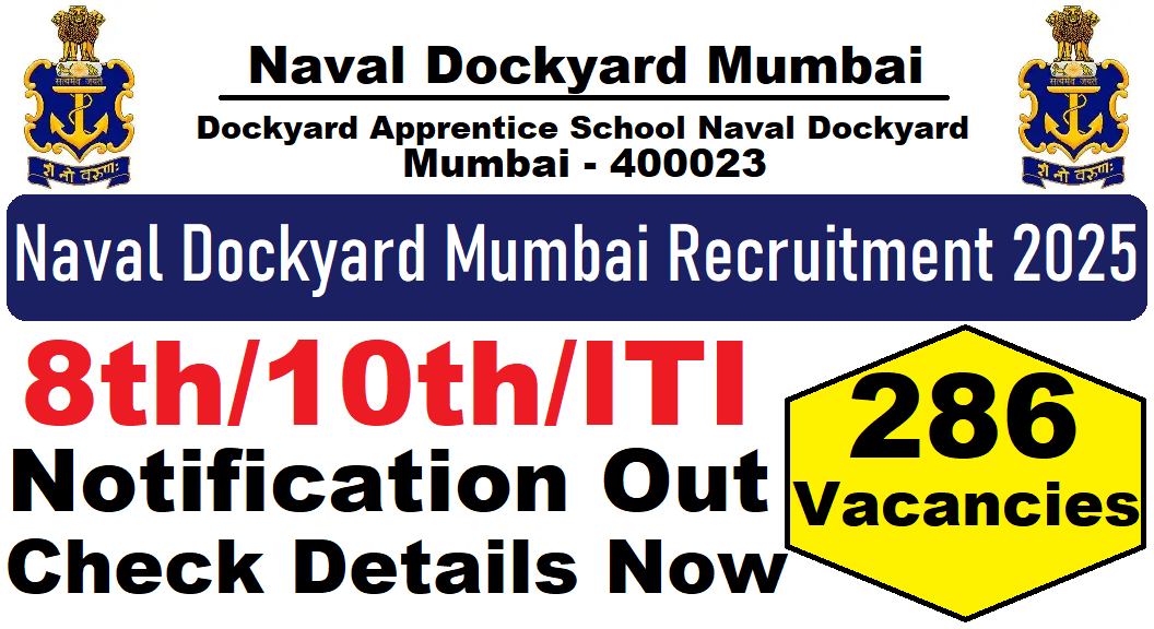 Naval Dockyard Mumbai Recruitment 2025 : Naval Dockyard Mumbai की ओर से 286 Posts पर Recruitment निकली है जिसका Online form 25/08/2025 से शुरू है | Naval Dockyard Mumba Recruitment 2025 Online form 12/09/2025 तक भरा जायेगा | 8th/10th/ITI Pass in various candidates Naval Dockyard Mumba Recruitment 2025 online form भर सकता है | Interested and eligible candidates Naval Dockyard Mumba Recruitment 2025 form भर सकते हैं | Naval Dockyard Mumba Recruitment Full Notification निचे दिया गया हैI Naval Dockyard Mumba Recruitment Apply Link निचे दिया गया है I