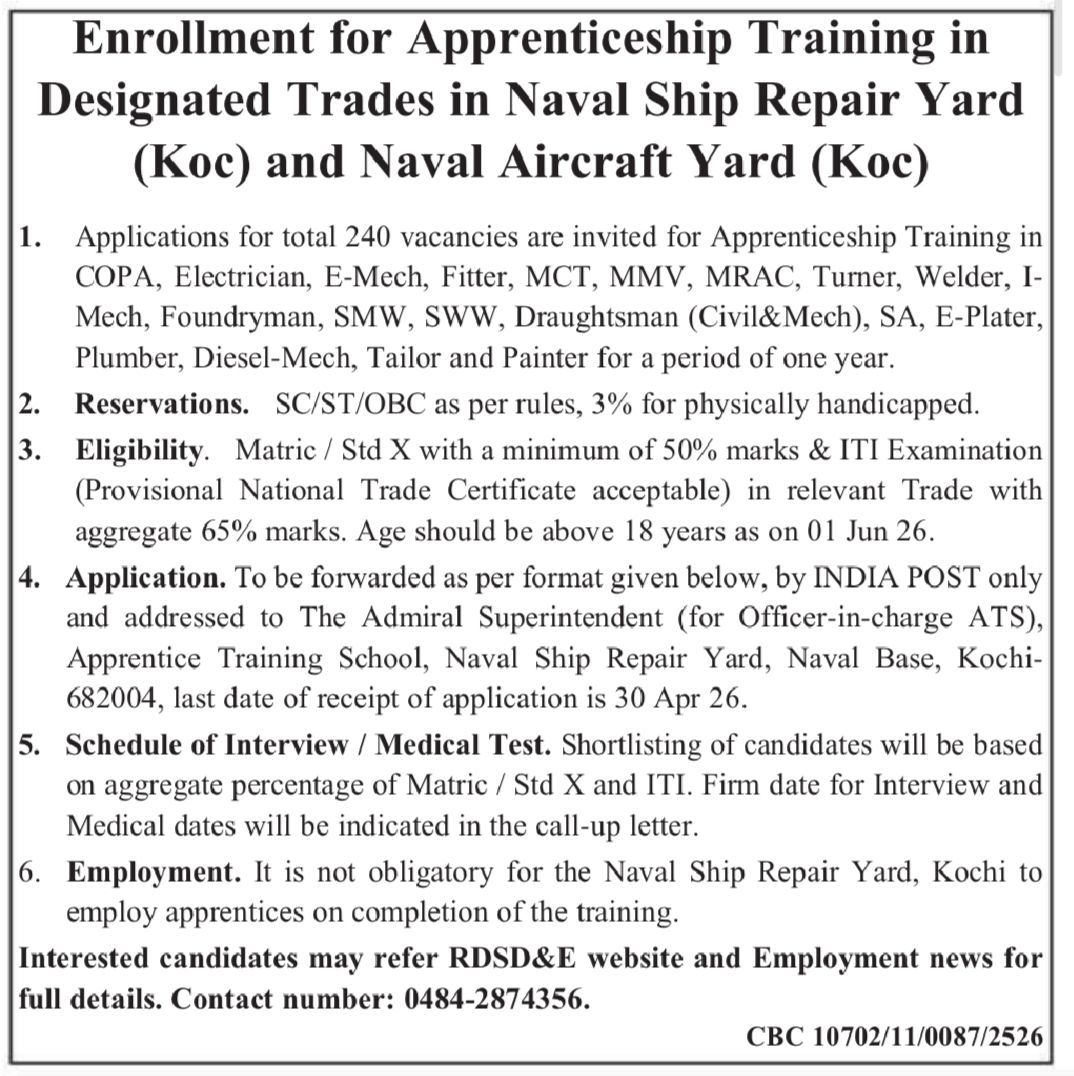 Naval Ship Repair Yard (NSRY), Kochi और Naval Aircraft Yard (NAY), Kochi — Indian Navy, Ministry of Defence, Government of India के अंतर्गत — ने Apprenticeship Act 1961 के तहत 21 Designated Trades में 240 Apprentice posts के लिए applications आमंत्रित की हैं।