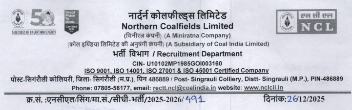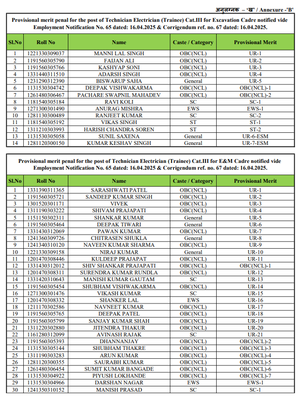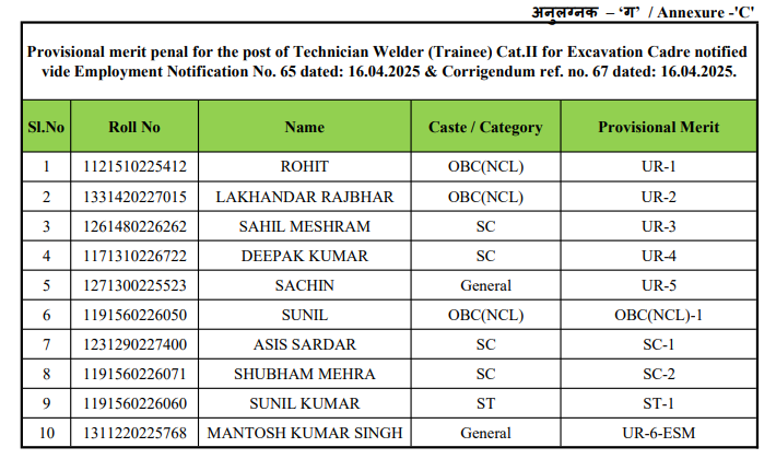 NCL Technician Final Merit list 2025 Out: This has the reference of Employment Notification no: NCL/HQ/PD/Manpower/DR/2025- 26/65 dated: 16/04/2025 and Corrigendum no. 67 dated: 16.04.2025 for direct recruitment to the post of Technician (Trainee) Positions and subsequent shortlisting of candidates vide Notice no. 420 dated: 29/10/2025 & Notice no. 437 dated: 16/11/2025, on the basis of the Computer Based Test held on 30th June 2025. The list of such candidates whose candidature is cancelled due to the reasons mentioned against their names has been published vide Notice no: 490 dated: 20/12/2025. The provisional merit panel for appointment of candidates against the notified vacancies for the post of Technician Fitter (Trainee) Cat. III is attached as Annexure-‘A’, Technician Electrician (Trainee) Cat. III is attached as Annexure-‘B’ and Technician Welder (Trainee) Cat. II is attached as Annexure-‘C’.
