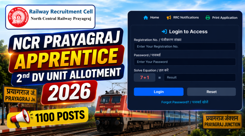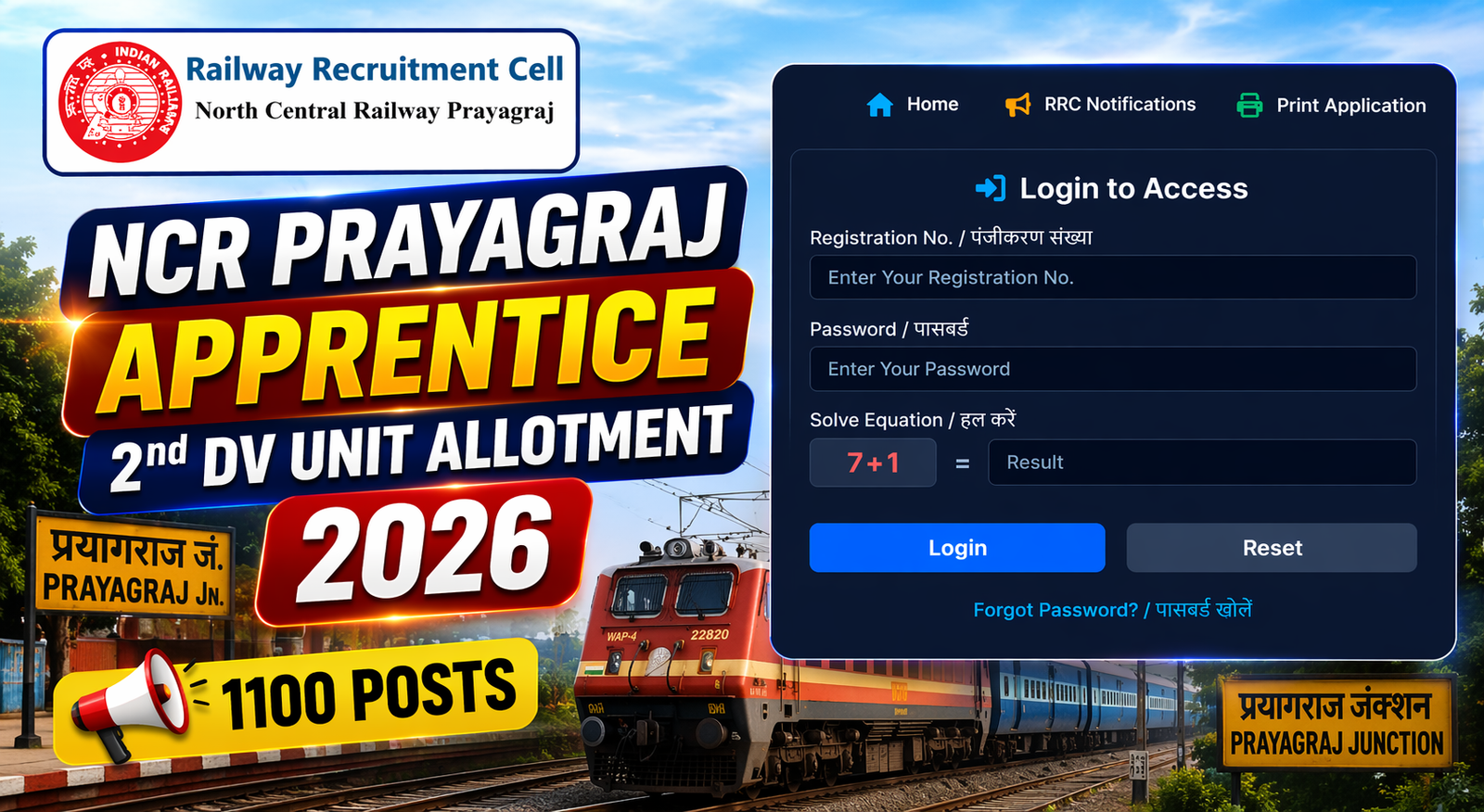 NCR Prayagraj Apprentice 2nd DV Unit Allotment 2026: रेल भर्ती प्रकोष्ठ, उत्तर मध्य रेलवे, प्रयागराज ने एक्ट अप्रेंटिसशिप जोनल नोटिफिकेशन 01/2025 के अंतर्गत द्वितीय दस्तावेज सत्यापन (09.03.2026 से 12.03.2026) में उपस्थित अभ्यर्थियों को यूनिट आवंटन (Unit Allotment) कर दिया गया है।