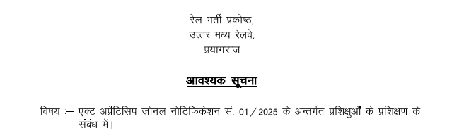 विषय: एक्ट अप्रेंटिस जोनल नोटिफिकेशन सं. 01 / 2025 के अन्तर्गत प्रशिक्षुओं के प्रशिक्षण के संबंध में।