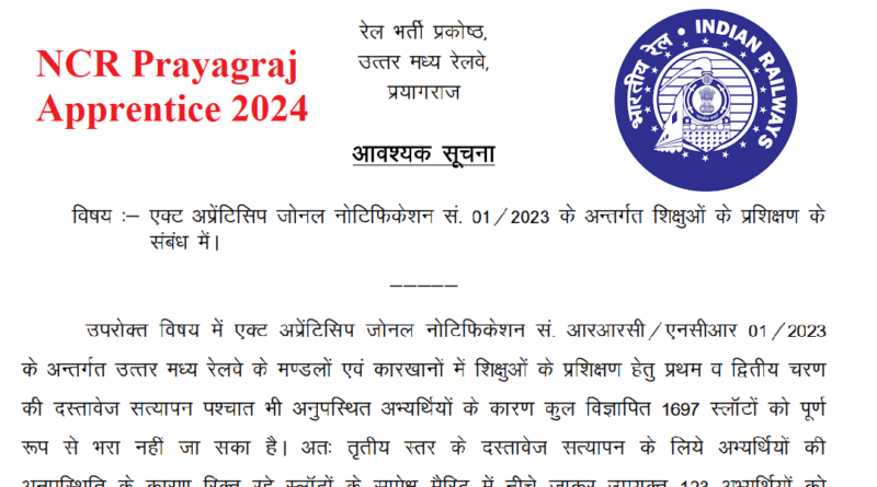 NCR Prayagraj Apprentice 3rd Merit list 2024 out, 1664 Posts