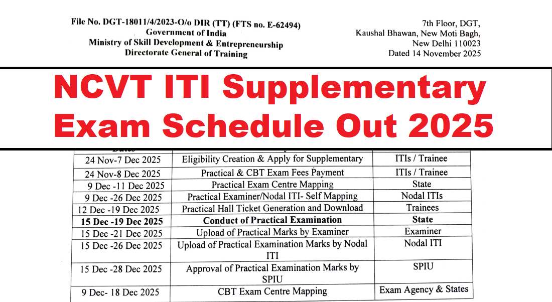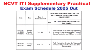 NCVT ITI Supplementary Exam Schedule 2025 Out: It is informed that the leftover/supplementary examination-2025 of trainees under Craftsmen Training Scheme (CTS) is planned to be held in the month of December 2025. As per the three permissible number of supplementary attempts, trainees of admission year 2021 (second year of two-year trades) and all trainees from admission year 2022 and onwards will be eligible to appear in this examination. NCVT Supplementary Exam start from 15-12-2025. NCVT ITI Supplementary Exam Schedule given below:-
