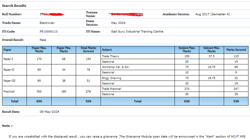NCVT ITI CBT Exam Result Sample 2024