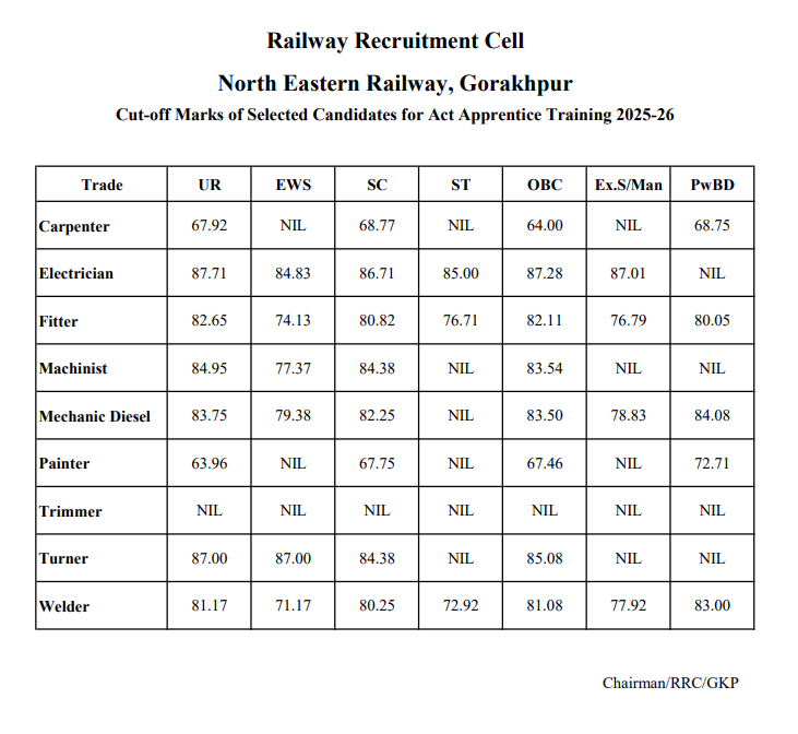 NER Gorakhpur Apprentice 2025 Official cut off