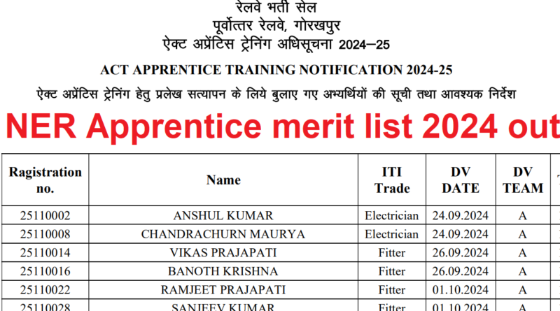 NER Gorakhpur Apprentice Merit list 2024 out: RRC NER Gorakhpur की ओर से ITI Pass Candidates के लिए 1104 Posts पर Apprenticeship निकली है जिसका Online form 12.06.2024 से भरना शुरू हुआ था| RRC NER Gorakhpur Apprentice online form 11.07.2024 तक भरा गया| ITI Pass Candidates को Railway में 1 साल के लिए Apprentice Training का मौका मिलगा | ITI Pass Electrician, Fitter,Welder, Carpenter,Painter,Machinist, Turner etc trade online form भरे थे|NER Gorakhpur Apprentice 2024 की 24-08-2024 को Reject Merit list जारी हुआ था | NER Gorakhpur Apprentice Document Verification Merit list जारी कर दिया गया है | NER Gorakhpur Apprentice Merit list 2024 PDF निचे दी गयी है |