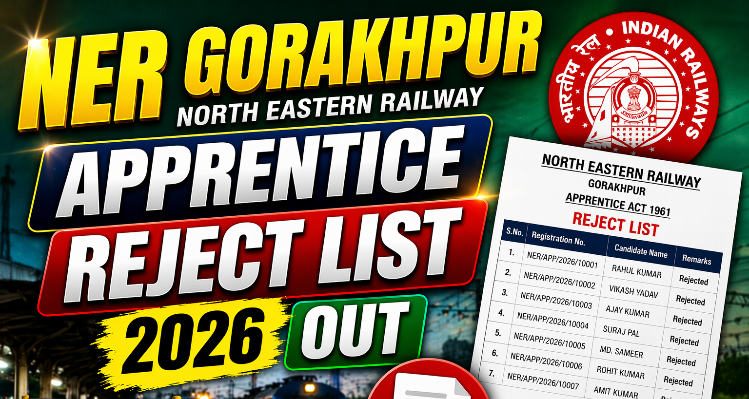 NER Gorakhpur Apprentice Reject List 2026 जारी!