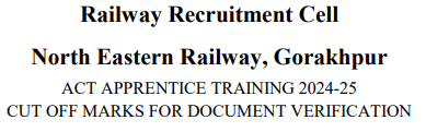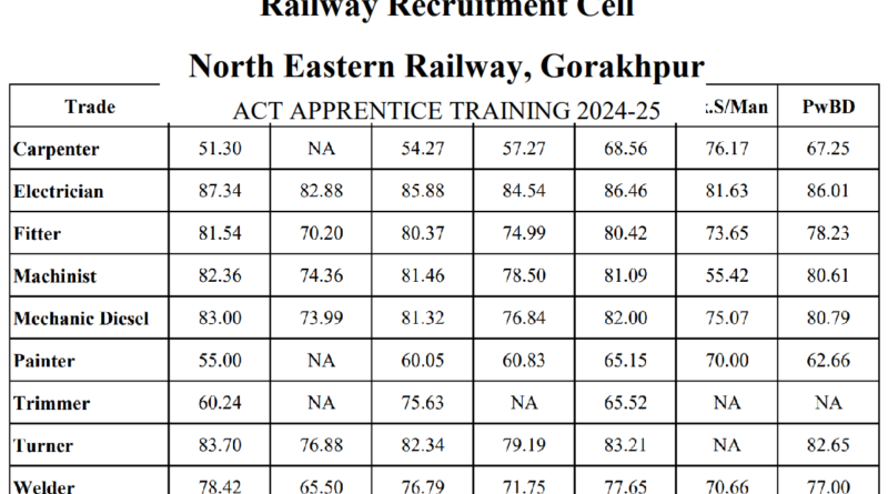 NER Gorakhpur Railway Apprentice Cut off 2024-25:RRC NER Gorakhpur की ओर से ITI Pass Candidates के लिए 1104 Posts पर Apprenticeship निकली है जिसका Online form 12.06.2024 से भरना शुरू हुआ था| RRC NER Gorakhpur Apprentice online form 11.07.2024 तक भरा गया| ITI Pass Candidates को Railway में 1 साल के लिए Apprentice Training का मौका मिलगा | ITI Pass Electrician, Fitter,Welder, Carpenter,Painter,Machinist, Turner etc trade online form भरे थे|NER Gorakhpur Apprentice 2024 की 24-08-2024 को Reject Merit list जारी हुआ था | NER Gorakhpur Apprentice Document Verification Merit list जारी कर दिया गया है साथ में NER Gorakhpur Apprentice Cut off 2024-25 भी जारी कर दिया गया है | RRC NER Gorakhpur Railway Apprentice Cut off PDF निचे दी गई है |