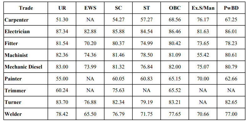 For selecting the candidates for Act Apprentice Training, the candidates have been called for Document Verification in three times(3x) of the vacancies, based on the average of percentage of High School and ITI Marks as per details provided by the candidates in their application form. The Category wise cutoff percentages for various trades are given below:-