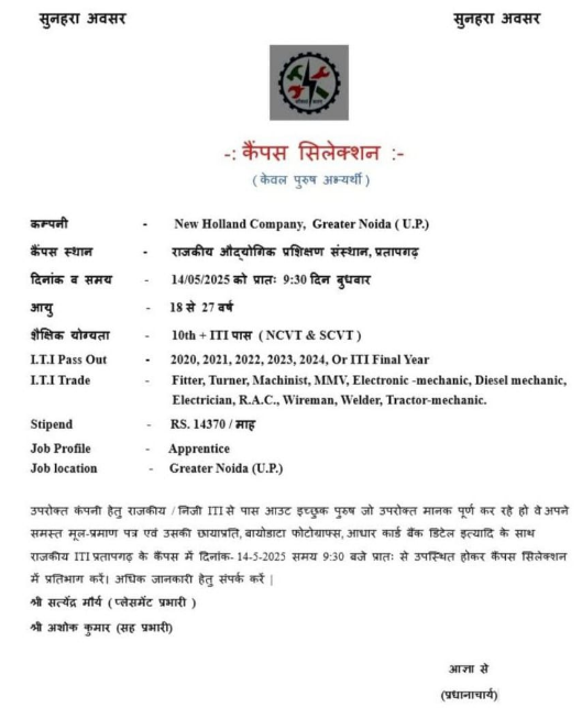 New Holland Recruitment 2025 : New Holland Tractor Manufacturing Plant की ओर से Motor Mechanic, RAC, Electrician, Tractor mechanic, diesel Mechanic, Machanist, MMV, Turner, Welder, Fitter Posts पर Campus Placement निकली है जिसका Interview Date 14 May 2025 , सुबह 10:00 बजे है|ITI Pass in various candidates Offline Campus Placement में शामिल हो सकते हैI आपकी Campus Placement Location – Rajkiya Audhogik Prakshid Sansthan Pratapgadh रहने वाला हैI New Holland Campus Placement 2025 Full Notification निचे दिया गया है |