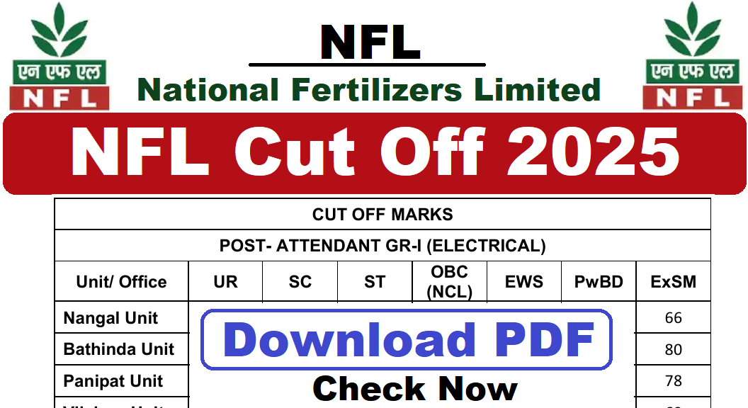 NFL Cut Off 2025 : National Fertilizers Limited की ओर से ITI, Diploma, BSc और अन्य candidates के लिए Non Executive Recruitment 2024 निकली थी जिसका Online form 08/11/2024 तक भरा गये था | BFL Recruitment 2024 Attendant Gr-1, Loco Attendant Gr-III, X-Ray Technician, Nurse, Jr. Engineering Assistant. Gr-II, Store Asst., etc various posts पर online form भरा गया था | NFL Non Executive Recruitment 2024 Exam 7th, 8th, 14th,15th and 21st December, 2024 को होने के बाद NFL Non Executive Answer key 24-12-2024 को जारी किया गया था |NFL Dec 2024-March 2025 में Exam हुआ था जिसमे Jammu City में हुए exam को Cancel कर दिया गया है | NFL Cut Off 2025 PDF निचे दी गयी है|