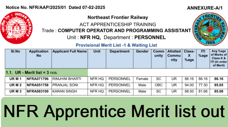 NFR Railway Apprentice 6 New Merit list 2024-25 Out, 5647 Posts, RRC NFR Apprentice Cut off 2025