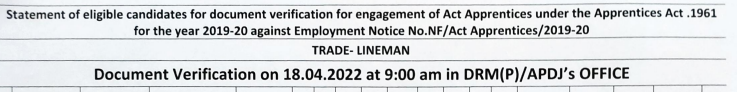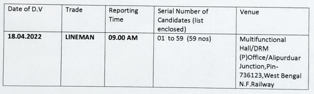 18.04.2022Lineman09:00 amMultifunctional Hal /DRM office /Alipurduar Junction, Pin 736123, West Bengal NF Railway