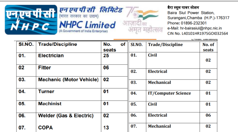 NHPC Apprentice Recruitment 2024: Baira Siul Power Station, NHPC Limited (A Mini Ratna Category-I, Government of india Enterprise) invites applications from eligible candidates for undergoing apprenticeship training under Apprentice Act,1961 in the following trades. NHPC Apprentice for ITI Pass Electrician, Fitter, MMV, Turner, Machinist, Welder, COPA Trade are eligible to apply. NHPC Gradaute candiates also apply for Apprenticeship 2024. NHPC Apprentice Apply before 15-04-2024.