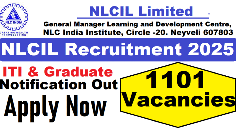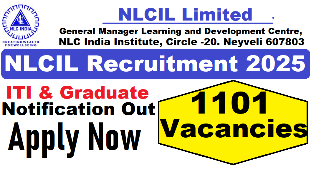 NLCIL Recruitment 2025 : NLCIL Limited की ओर से 1101 Posts पर Recruitment निकली है जिसका Online form 06/10/2025 से शुरू है | NLCIL Recruitment 2025 Online form 27/10/2025 तक भरा जायेगा | ITI & Graduate Pass in various candidates NLCIL Recruitment 2025 online form भर सकता है | Interested and eligible candidates NLCIL Recruitment 2025 form भर सकते हैं |NLCIL Recruitment Full Notification निचे दिया गया हैI NLCIL Recruitment Apply Link निचे दिया गया है I