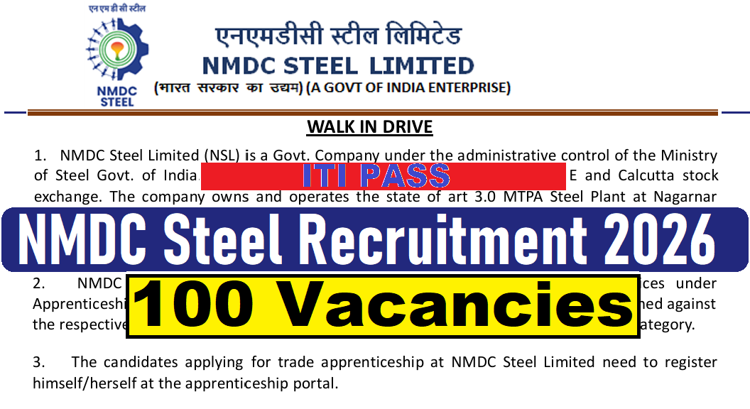 NMDC Steel Apprentice Recruitment 2026 : NMDC Steel Limited (NSL) की ओर से 100 Posts पर Walk-In-Interview निकली है जिसका Interview Date 12,13,14 & 15 January 2026 , सुबह 09:00 बजे है|ITI pass in various candidates Offline Walk-In-Interview में शामिल हो सकते हैI आपकी Walk-In-Interview Location -HRD Centre , NMDC Steel Limited, Studio Apartment Chokawada, District -Baster, Chhatisgarh-494001 रहने वाला हैI NMDC Steel Walk-In-Interview 2026 Full Notification निचे दिया गया है |