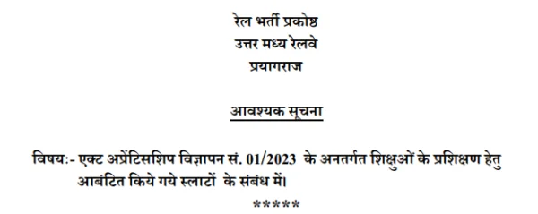 झॉसी मंडल में अप्रैन्टिस एक्ट 1961 के अन्तर्गत वर्ष 2023-24 के लिए एक्ट अप्रैन्टिसों के प्रशिक्षण हेतु RRC/PRYJ द्वारा जारी अधिसूचना सं0 01/2023 के परिपेक्ष्य में पात्र पाये गये अभ्यर्थियों का मूल दस्तावेजों का परीक्षण एवं प्रशिक्षण भेजे जाने के सम्बन्ध में।