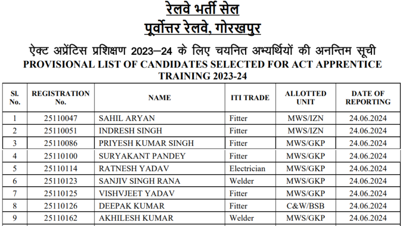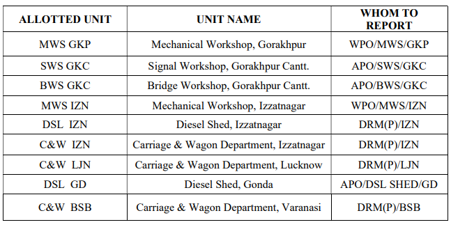 NER Gorakhpur Apprentice Unit Allotment 2024