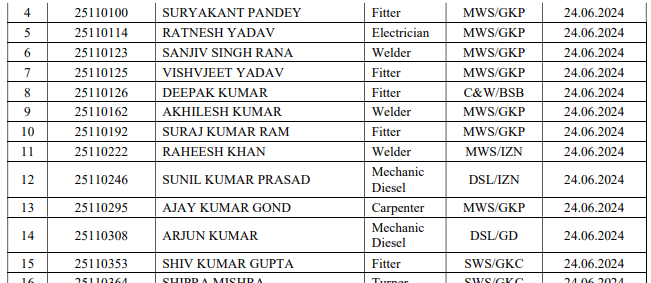 NER Gorakhpur Apprentice Merit list Sample 2024