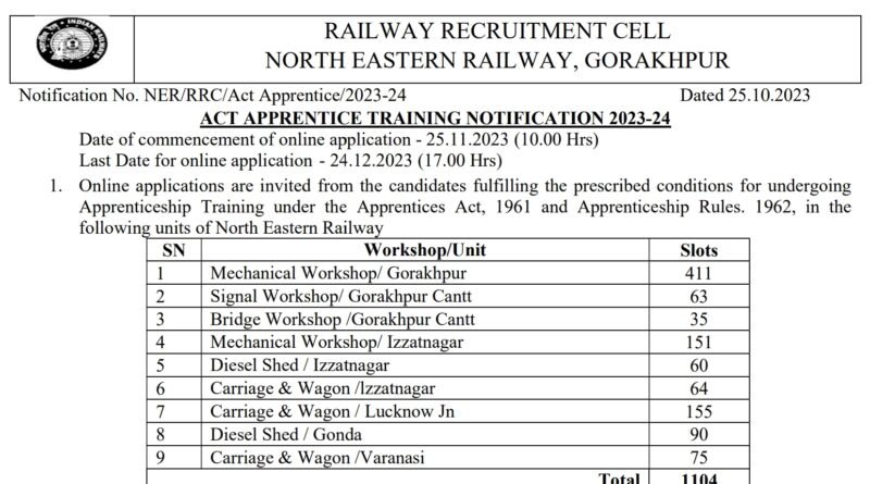 North Eastern Railway Apprentice 2024 Online form, 1104 Posts,24-12-2023 Last date