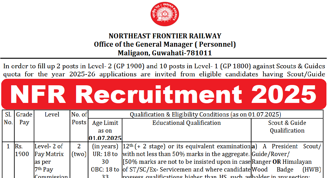 Northeast Frontier Railway Recruitment 2025 : Northeast Frontier Railway (NFR) की ओर से 12 Posts पर Recruitment निकली है जिसका Notification Release Date 06/06/2025 से शुरू है | Northeast Frontier Railway Recruitment 2025 Speed Post Application form 07/07/2025 तक भरा जायेगा | 10th, 12th & ITI Pass in various candidates Northeast Frontier Railway Recruitment 2025 Speed Post Application form भर सकता है | Interested and eligible candidates NFR Recruitment 2025 form भर सकते हैं | NFR Recruitment Full Notification निचे दिया गया हैI NFR Recruitment Send to Application Form Address निचे दिया गया है I