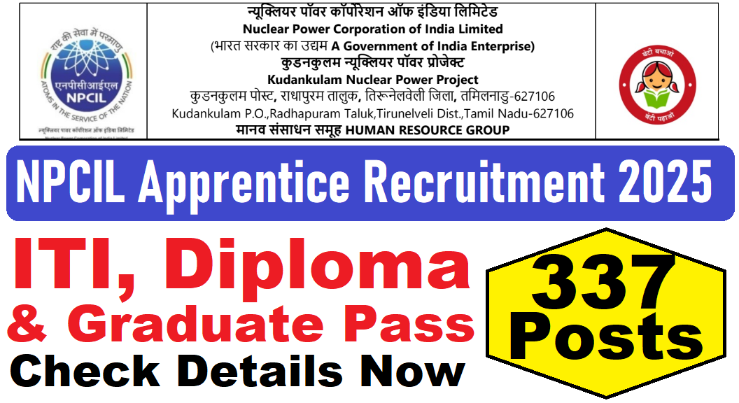 NPCIL Apprentice Recruitment 2025 : Nuclear Power Corporation of India Limited (NPCIL) की ओर से 337 Posts पर Recruitment निकली है जिसका Online form 20/06/2025 से शुरू है |NPCIL Apprentice Recruitment 2025 Online form 21/07/2025 तक भरा जायेगा | ITI, Diploma & Graduate Pass in various candidates NPCIL Apprentice Recruitment 2025 online form भर सकता है | Interested and eligible candidates NPCIL Apprentice Recruitment 2025 form भर सकते हैं | NPCIL Apprentice Recruitment Full Notification निचे दिया गया हैI NPCIL Apprentice Recruitment Register Link निचे दिया गया है I