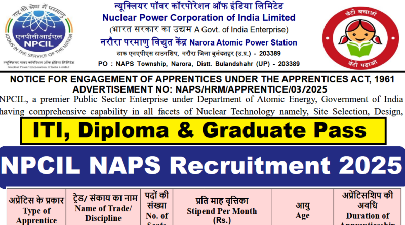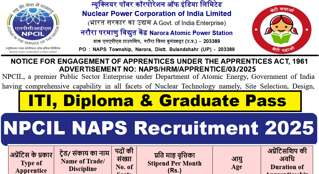 NPCIL NAPS Recruitment 2025 : Nuclear Power Corporation of India Limited (NPCIL) की ओर से 70 Posts पर Recruitment निकली है जिसका Online form 13/08/2025 से शुरू है | NPCIL NAPS Recruitment 2025 Online form 02/09/2025 तक भरा जायेगा | ITI, Diploma & Graduate Pass in various candidates NPCIL NAPS Recruitment 2025 online form भर सकता है | Interested and eligible candidates NPCIL NAPS Recruitment 2025 form भर सकते हैं | NPCIL NAPS Recruitment Full Notification निचे दिया गया हैI NPCIL NAPS Recruitment Apply Link निचे दिया गया है I