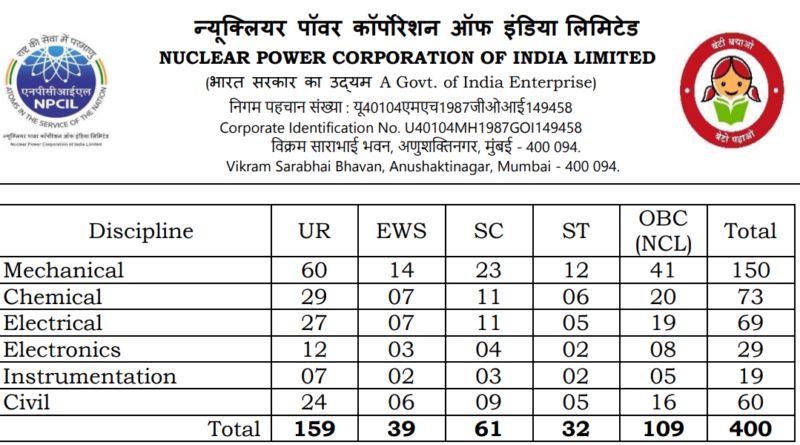 NPCIL Recruitment 2024, 400 Posts, 30/04/2024 last date