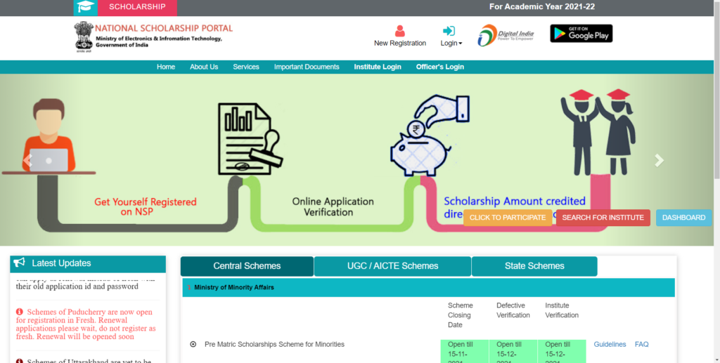 Indian Government के द्वारा NSP Scholarship Portal पर Pre matric तथा Post Matric Scholarship 2021 हेतु आवेदन शुरू हो गया है |