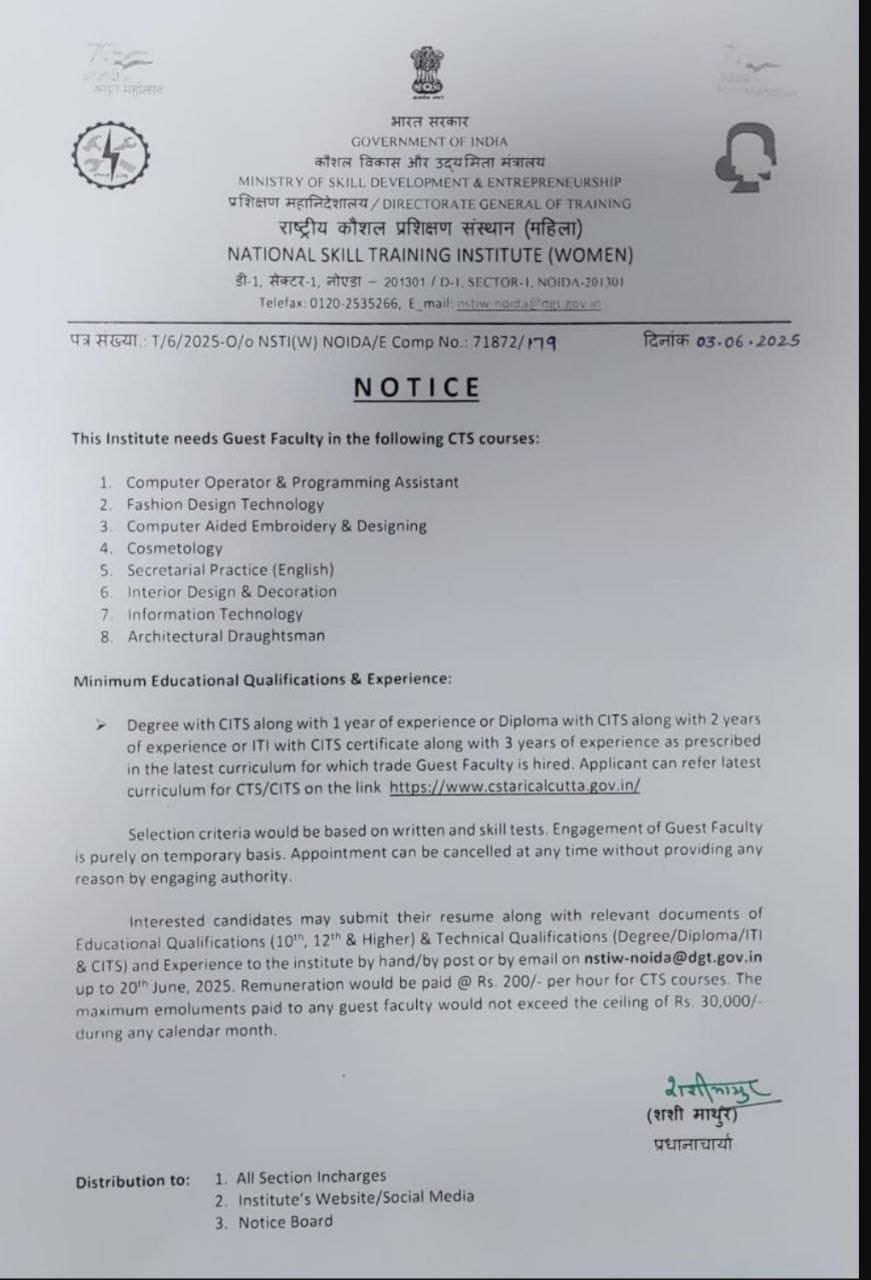 NSTI Instructor Recruitment 2025 : National Skill Training Institute (NSTI) की ओर से सिर्फ Female candidates के लिए Computer Operator & Programming Assistant , Fashion Design Technology , Computer Aided Embroidery & Designing ,Cosmetology , Secretarial Practice (English) , Interior Design & Decoration , Information Technology , Architectural Draughtsman Posts पर Recruitment निकली है जिसका Online form शुरू है | NSTI Instructor Recruitment 2025 Online form 20/06/2025 तक भरा जायेगा |ITI, Diploma & Degree Pass in various candidates NSTI Instructor Recruitment 2025 online form भर सकता है | Interested and eligible candidates NSTI Instructor Recruitment 2025 form भर सकते हैं | NSTI Instructor Recruitment Full Notification निचे दिया गया हैI NSTI Instructor Recruitment Apply Link निचे दिया गया है I
