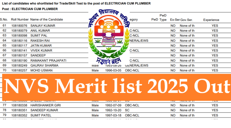 NVS Electricia cum Plumber, Mess etc Merit list 2025 Out: List of candidates shortlisted for Interview/Skill Test/ Trade Test for the posts of Legal Assistant, Stenographer, Electrician-cum-Plumber and Mess Helper on the basis of performance in recruitment examination held w.e.f. 14.05.2025 to 19.05.2025 for various Non-Teaching posts under Direct Recruitment Drive 2024. A notification for recruitment to various Non-Teaching posts was published in the month of March 2024 and recruitment examination was held from 14.05.2025 to 19.05.2025 under Direct Recruitment Drive 2024.Provision to display of scanned images of OMR answer Sheets and display/ challenges of answer keys was made on designated recruitment portal w.e.f. 10.06.2025 to 14.06.2025.