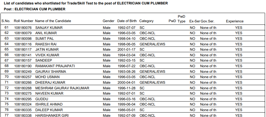 List of candidates shortlisted for Interview/Skill Test/ Trade Test for the posts of Legal Assistant, Stenographer, Electrician-cum-Plumber and Mess Helper on the basis of performance in recruitment examination held w.e.f. 14.05.2025 to 19.05.2025 for various Non-Teaching posts under Direct Recruitment Drive 2024.