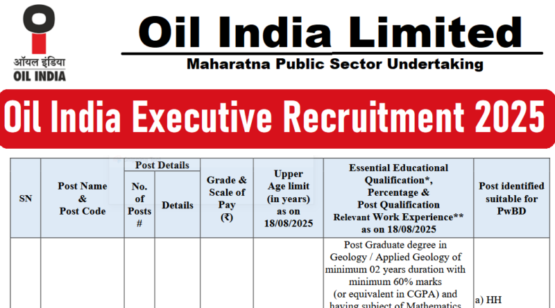 Oil India Executive Recruitment 2025, Grade C Latest Vacancy 2025, 18/08/2025 Last Date