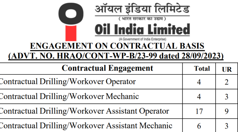 Oil India Limited Recruitment 2023: Oil India Limited (OIL), a Maharatna Public Sector Undertaking intends to engage following personnel (domicile of Assam and Arunachal Pradesh) purely on contractual basis for immediate engagement for Field Headquarters, Duliajan. The contractual engagement requirement mentioned hereunder may entail working in shifts involving arduous and hazardous nature of jobs in remote/far-flung OIL installations in the production and exploration areas and also on “On-Call” duty basis.