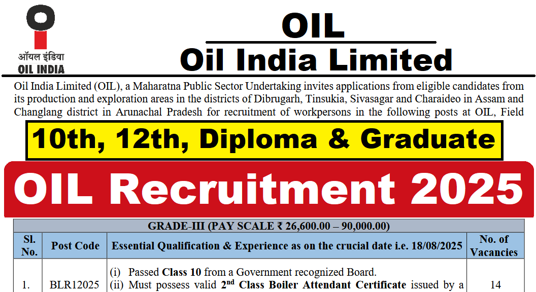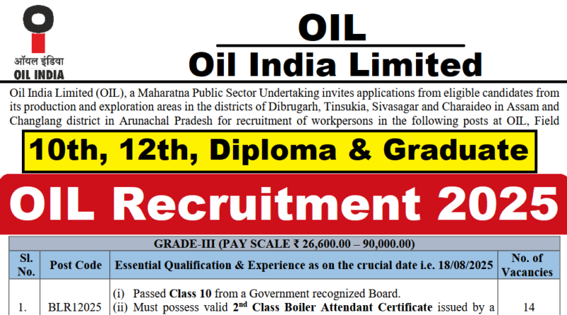 OIL Recruitment 2025, 10th, 12th, Diploma & Graduate Pass Latest Vacancy 2025, 18/08/2025 Last Date