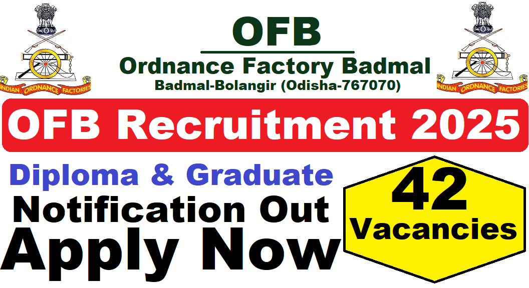 Ordnance Factory Badmal Recruitment 2025 : Ordnance Factory Badmal (OFB) की ओर से 42 Posts पर Recruitment निकली है जिसका Online form शुरू है |Ordnance Factory Badmal Recruitment 2025 Online form 18/10/2025 तक भरा जायेगा |Diploma & B.Sc, B.Com. & BA Pass in various candidates Ordnance Factory Badmal Recruitment 2025 online form भर सकता है | Interested and eligible candidates Ordnance Factory Badmal Recruitment 2025 form भर सकते हैं |Ordnance Factory Badmal Recruitment Full Notification निचे दिया गया हैI Ordnance Factory Badmal Recruitment Apply Link निचे दिया गया है I